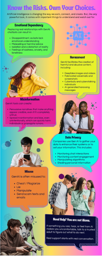 My goal was to understand how teens perceived GenAI and what factors contribute to trust, engagement, and comprehension. GenAI use is an increasingly complex and polarizing topic, with many teens and their parents unaware of potential dangers and little oversight. While the technology itself is advancing rapidly, public understanding often lags behind. I wanted to better understand how to empower students to use AI effectively and safely without instilling fear. The second goal was to encourage students to ask for help when needed.